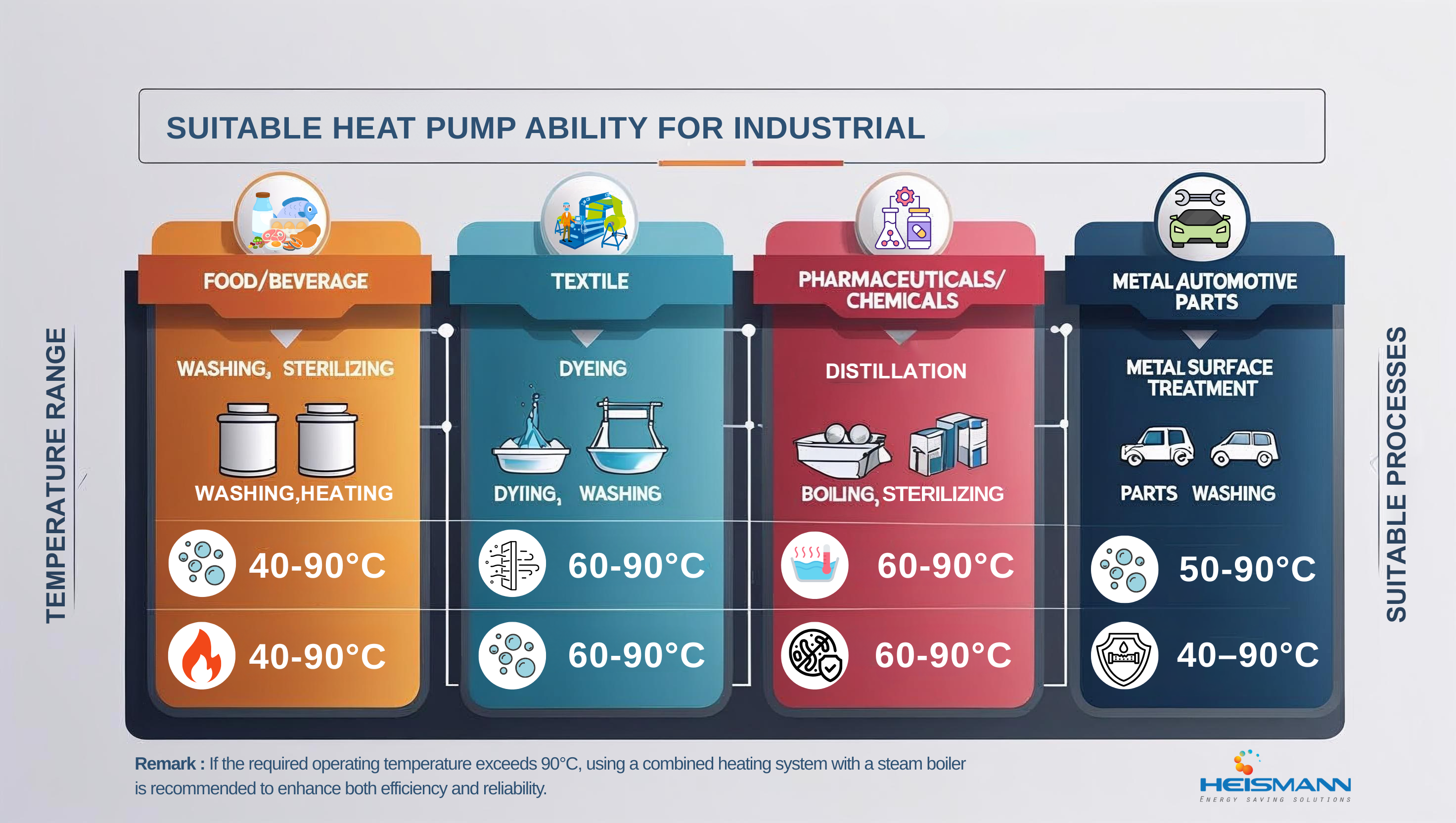 Heat processes requiring temperatures up to 90°C are suitable for hot water heat pumps. For applications needing temperatures above 90°C, it is recommended to consider using a steam boiler in combination for hot water production.