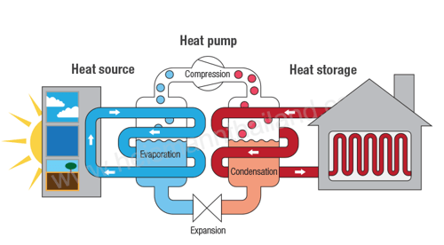มาถึงอุปกรณ์ที่เป็น พระเอก ที่จะช่วยลดการใช้พลังงานกัน นั่นคือฮีทปั๊ม(Heat Pump) หรือปั๊มความร้อน เครื่องนี้ มีหลักการทำงานที่ไม่เหมือนกับอุปกรณ์ที่กล่าวมาข้างต้น โดย เครื่องฮีทปั๊ม ใช้วงจรสารทำความเย็น ในการขับเคลื่อนระบบ เกิด ”การแลกเปลี่ยน” พลังงาน จากที่หนึ่ง ไปยังอีกที่หนึ่ง ไม่ใช่ “การเปลี่ยนแปลง” รูปแบบพลังงาน จึงทำให้เครื่องฮีตปั๊ม มีประสิทธิภาพสูง ถึง 4 เท่า